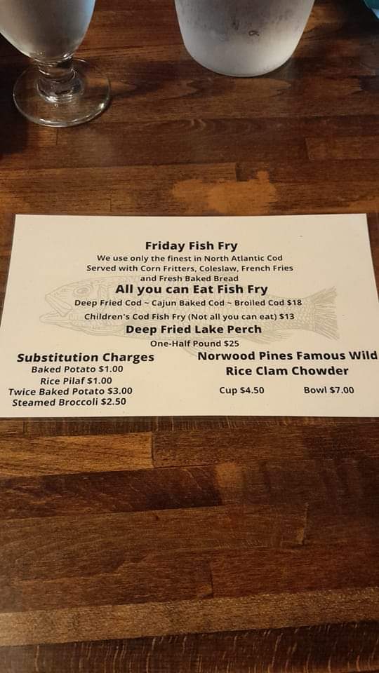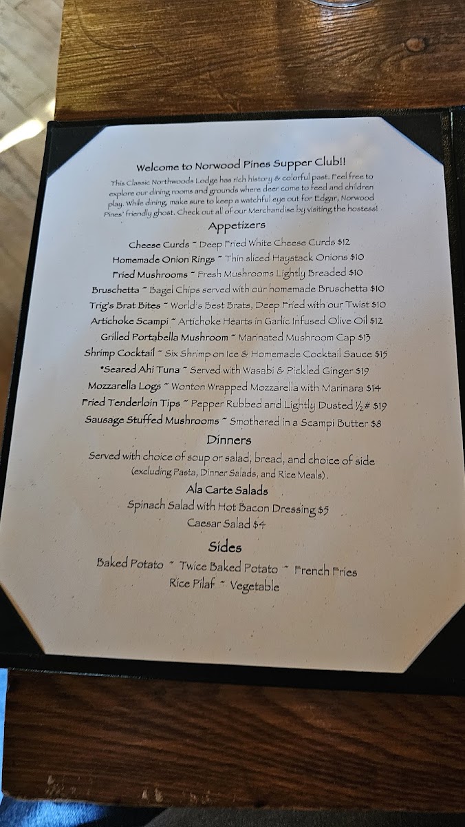 Welcome to Norwood Pines Supper Club, a hidden gem located in the heart of Minocqua, Wisconsin. This charming establishment invites you to indulge in a thoughtfully curated menu that beautifully blends classic supper club fare with a unique twist. Begin your culinary journey with their delightful Cheese Curds or Artichoke Scampi, both perfect options for sharing. When it comes to the main course, the Surf and Turf is a must-try, featuring tender filet mignon paired with succulent grilled shrimp.